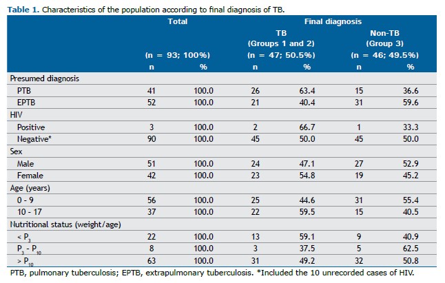 The final diagnosis of PTB was established based on clinical and radiological findings and clinical response after two months of treatment initiation. Children and PLHIV with a “traces detected” result were considered positive.(7,8) Patients were classified into three groups: Group 1, confirmed TB (microbiological confirmation); Group 2, unconfirmed TB (clinical diagnosis without microbiological confirmation); and Group 3, non-TB.
