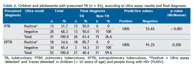 We chose to include the MoH-Brazil score as one of the criteria for the final diagnosis in this study, as it has been validated in previous research demonstrating high sensitivity and specificity. In addition, the two-month follow-up period allowed greater confidence in confirming each participant’s final diagnosis.(6,7) The low sensitivity of 50% observed in PTB in this study had already been reported by Battaglia et al. (2025) in another paper by our group. Accordingly, the authors emphasized the importance of using complementary diagnostic approaches for PTB rather than relying solely on molecular testing, which is consistent with the literature.(1,2,6) On the other hand, the sensitivity of 86% (compared to culture) observed in EPTB in our study supports the value of testing multiple specimen types for accurate diagnosis in children and adolescents.(12)