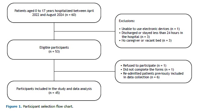 Inclusion criteria were as follows: CF patients in the 0- to 17-year age bracket hospitalized in the HCPA Pediatric Inpatient Unit during data collection (from April of 2022 to August of 2024). Patients without a companion or those with conditions that prevented the use of electronic devices were excluded from the study. Figure 1 illustrates the participant selection process.
