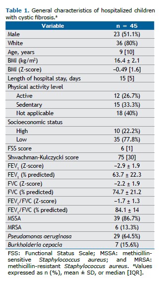 RESULTS Our study included 45 hospitalized children and adolescents with CF. Of those, 36 (80%) were White and 23 (51%) were male. The median age was 9 years. In our sample, 12 (26.7%) were classified as active. Table 1 presents the general characteristics of the study participants.