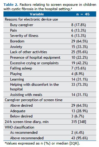 One of the limitations of our study is its cross-sectional design, which does not allow for inferences over time. Another limitation is the self-report nature of the recall diary used to record ST; because this is a subjective measure, it may be underestimated by the observer. In addition, our sample was small because of low hospitalization rates in the pediatric population. Furthermore, ours was a convenience sample, which does not allow generalization of the results for this population. On the other hand, one strength of the present study is its contribution to a better understanding of screen exposure, a highly relevant issue today. We believe that our study can foster reflection and support the development of future measures in hospital settings to guide patients and their families regarding ST. Additionally, our analysis of the association between ST and other important factors affecting the lives of CF patients adds significant value to research.