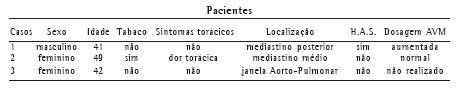 INTRODUÇÃO: As massas mediastinais variam desde cistos ou tumores. Os tumores neurogênicos, timomas e cistos benignos abrangem 60% de todas as lesões passíveis de ressecção cirúrgica, enquanto os linfomas, teratomas e doenças granulomatosas correspondem juntas a 30%. As lesões não cirúrgicas, lesões vasculares, aneurisma da aorta típico, constituem 10% das massas mediastinais. OBJETIVO: Avaliar os pacientes portadores de tumores do mediastino, submetidos a tratamento cirúrgico, com relação a idade, sexo, tipo histológico, tratamento adjuvante, fatores prognósticos e complicações. MÉTODO: Estudo retrospectivo de dados de 48 prontuários médicos no período compreendido entre março de 1991 a janeiro de 2005, de pacientes submetidos a procedimentos cirúrgicos devido à presença de cistos ou tumores do mediastino. RESULTADO: Do total, 31(65%) pacientes eram do sexo feminino e 17(35%) do sexo masculino. A faixa etária variou de 5 a 93 anos com uma média de 40 anos. Trinta e um pacientes (64,58%) foram submetidos a toracotomia, quatro(8,33%) pacientes a videotoracoscopia e 11(22,91%) pacientes submetidos à biópsia isolada. Com relação ao tipo histológico, 11 casos correspondiam a timomas, 9 linfomas , 8 tumores neurogênicos , 5 cistos, 2 teratomas, lipomas em 1 A radioterapia e quimioterapia foi utilizada em 9 (18,75%) dos pacientes. CONCLUSÃO: Não há diferença significativa entre as incidências do timoma, linfoma e os tumores neurogênicos, nesta série. - Ocorreu associação de doenças de base imunológica como a Miastenia gravis e a aplasia medular com alguns tipos de tumores, principalmente o timoma. - Em nosso meio as mulheres são mais acometidas pelas massas mediastinais do que os homens.
