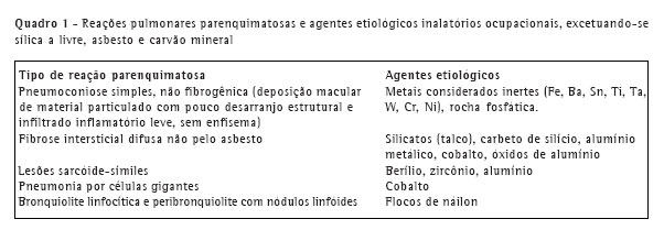 CONCLUSÃOAs pneumoconioses não usuais, ou seja, excetuando-se a silicose, a asbestose e a pneumoconiose do trabalhador do carvão, podem num primeiro momento parecer raras. No entanto, a inespecificidade delas mostra a necessidade da anamnese ocupacional como importante instrumento de busca etiológica de afecções pulmonares intersticiais que podem cair na vala comum do idiopático. Assim, é essencial o questionamento sistemático e aprofundado das exposições ocupacionais a poeiras dos pacientes sob investigação de intersticiopatias, sob risco de negligenciarmos um aspecto vital do tratamento e prognóstico de alguns casos que mereçam afastamento definitivo do trabalho. Isto só poderá ser feito legalmente nos casos com definição de nexo causal que, em geral, é dado pelos aspectos clínicos radiológicos juntamente com a história ocupacional de exposição.