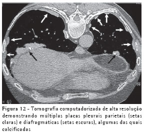 A TCAR é um método mais sensível e específico do que a radiografia. As placas pleurais são caracterizadas na TCAR como espessamentos pleurais focais, geralmente bilaterais, descontínuos, com bordas lisas, em platô, e por vezes com calcificações (Figura 12).(10-11)