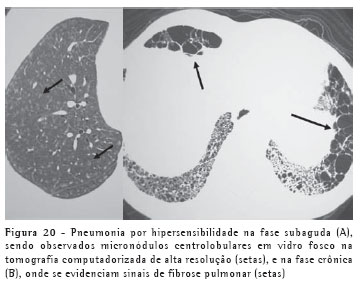 A pneumonia por hipersensibilidade pode ter apresentações aguda, subaguda e crônica. Os achados de imagem variam de opacidades e consolidações, na forma aguda, a micronódulos centrolobulares em vidro fosco (subaguda) e sinais de fibrose pulmonar na fase crônica (Figura 20).