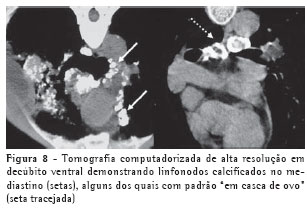 A TCAR apresenta ainda maior eficácia do que a radiografia para demonstração de linfonodomegalias ou de calcificações linfonodais (Figura 8).