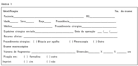A seguir, apresentamos uma sugestão de rotina de encaminhamento de tecido para exame de anatomia patológica utilizada em nosso serviço. Salientamos a necessidade de encaminhamento do material aliada a uma minuciosa informação dos dados clínicos e hipóteses dos médicos que conduzem o caso. Com isto o patologista acrescenta informações importantes que podem subsidiar seus achados, informando com maior precisão o diagnóstico ao clínico ou cirurgião. (Anexo 1)