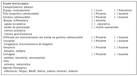 Procedimentos recomendados em biópsias obtidas por pleuroscopiasCortes por congelamento de porções representativas da pleura podem ser necessários em pacientes com quadros clínicos graves. Colorações de rotina para doenças infecciosas poderão ser feitas nos cortes por congelamento, para pesquisa de BAAR e fungos. No quadro 4 estão listados os procedimentos recomendados para biópsias em pleuroscopias.