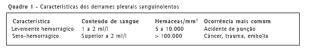 Nos derrames neoplásicos, pós-trauma ou por embolia pulmonar, a contagem de eritrócitos geralmente é superior a 100.000/mm3 (Quadro 1). Neste sentido, em derrames pleurais francamente sanguinolentos recomenda-se a realização do hematócrito do líquido pleural. Hematócritos inferiores a 1% freqüentemente não estão associados a sangramentos importantes.(4) Hematócritos superiores a 1% são observados em derrames neoplásicos, traumáticos e na embolia pulmonar.(5) Líquidos francamente hemorrágicos, com hematócrito superior a 50% do hematócrito do sangue periférico, são compatíveis com hemotórax.(6) O hematócrito pode ser realizado no tubo colhido para o exame citológico, ou seja, no mesmo tubo utilizado para hemograma (tubo contendo o anticoagulante ácido etilenodiaminotetracético - EDTA).