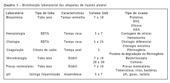 O volume recomendado de líquido pleural para análise laboratorial completa é em torno de 50 a 60 ml. O líquido pleural obtido deve ser distribuído nos tubos apropriados (tubos de 5 a 10 ml), de acordo com as análises a serem realizadas. Recomenda-se o encaminhamento imediato da amostra ao laboratório. Se, eventualmente, o material não puder ser enviado logo após a coleta, sugere-se que o mesmo seja mantido em geladeira comum (4 a 8 oC), e não no congelador, até o encaminhamento ao laboratório, que deve ser o mais precoce possível.