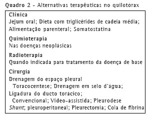 Existem diversas modalidades de tratamento do quilotórax (Quadro2).(9-12)