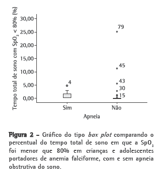 Raros são os trabalhos que descrevem a sobreposição da síndrome da apneia obstrutiva do sono (SAOS) na anemia falciforme (AF), ou seja, a exata prevalência da SAOS, sua etiologia e sua história natural em portadores de AF permanece pouco definida.(1) Sabe-se que a SAOS se associa a hipoxemia, hipercapnia e acidose, podendo induzir a polimerização da hemoglobina S (Hb S), a potencialização do processo de falcização e o aparecimento das crises vaso-oclusivas.(2) Além disso, a dessaturação noturna ocorre em aproximadamente 80% das crianças com AF, podendo ser resultado da SAOS.(3)