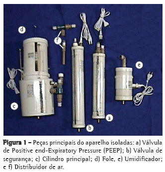 ConstruçãoAs partes do aparelho foram construídas individualmente: válvula de pressão expiratória final positiva, conhecida como Positive end-Expiratory Pressure (PEEP) em inglês; válvula de segurança; cilindro principal; fole; lastros de pressão; umidificador; manômetros; painel de controle; porão; caixa de armazenamento; e distribuidor de ar.
