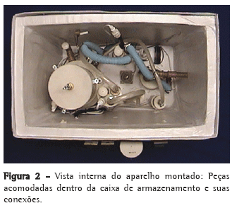 MontagemO sistema foi montado dentro da caixa de armazenamento utilizando-se cola de silicone para fixar o cilindro principal, a válvula de PEEP, a válvula de segurança e o umidificador no fundo da caixa. Havia orifícios de escoamento sob as peças. Posteriormente, fixou-se ao assoalho da caixa: um ventilador (homogeneização térmica); uma lâmpada para iluminação; e uma outra lampada para aquecimento.