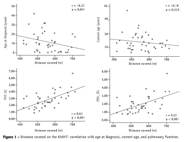 It is important to emphasize that we found a significant correlation between the distance covered on the 6MWT to correlate significantly with FEV1 and FVC (in liters and in % of predicted), whereas no such correlation was identified in the other, previously mentioned, studies involving submaximal exercise capacity in CF.(2,15,17) This might be related to the fact that those studies included patients with mild to moderate lung disease.