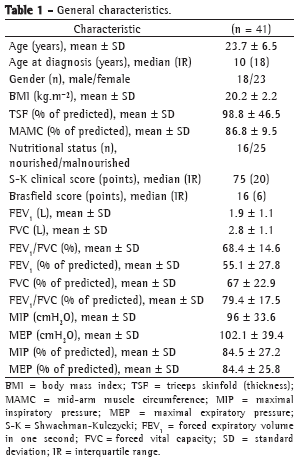 ResultsFrom September of 2004 to January of 2006, all patients with CF monitored by the HCPA Adolescent and Adult CF Treatment Team were studied. Table 1 shows the general characteristics of these patients. Of the 41 patients studied, 23 (56%) were female and 18 (44%) were male. The mean age was 23.7 ± 6.5 years (range, 16-47 years), and the median age at diagnosis was 10 years. All patients were Caucasian. The mean BMI was 20.2 ± 2.2 kg.m-2 (range, 15.9-26.5 kg.m-2). The mean % of predicted TSF thickness and the mean % of predicted MAMC were, respectively, 98.8 ± 46.5% and 86.8 ± 9.5%. The median S-K clinical score was 75 points, and the median Brasfield radiographic score was 16 points. The mean % of predicted FEV1 and the mean % of predicted FVC were, respectively, 55.1 ± 27.8% and 67 ± 22.9%. The mean % of predicted FEV1/FVC ratio was 79.4 ± 17.5%. The mean % of predicted MIP and the mean % of predicted MEP were, respectively, 84.5 ± 27.2% and 84.4 ± 25.8%. A total of 10 patients (24.4%) were infected with Burkholderia cepacia, and 23 (56.1%) were infected with Pseudomonas aeruginosa.