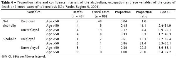 to establish odds ratios and prevalence ratios based on the data available for 137 patients (48 deaths and 89 cured cases of TB). In the final model, the three variables that were found to be most closely correlated with death were alcoholism, occupation, and age (Tables 3 and 4).