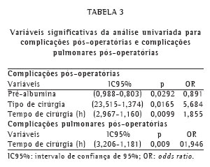 De acordo com o estudo realizado, houve significância estatística de CPO por alterações de pré-albumina, sendo que 43,75% dos pacientes tiveram complicações quando apresentaram pré-albumina baixa. Essas relações da pré-albumina são também demonstradas na literatura,(21) acentuando-se a ênfase que deve ser dada à avaliação desta proteína.