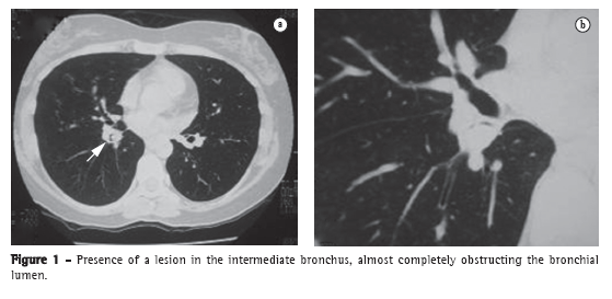 Case reportA 39-year-old female patient presented with a history of recurrent pneumonia, together with sporadic episodes of productive cough and fever. In the two preceding years, the patient had had four episodes of moderate volume hemoptysis. In the preoperative investigation, a CT scan of the chest revealed a lesion in the intermediate bronchus (Figure 1), as well as cystic bronchiectasis in the right lower lobe (Figure 2). Fiberoptic bronchoscopy confirmed the tomographic finding of a wine-colored, exophytic endobronchial lesion at the root of the intermediate bronchus, and biopsy of the lesion revealed a typical carcinoid tumor.