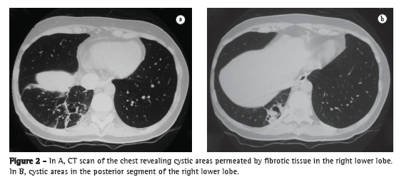 Cases of ILPS typically occur in adolescents and young adults with a history of recurrent infections of the respiratory tract, hemoptysis, and dyspnea. Some ILPS patients develop cardiac symptoms, which are a consequence of the left-to-left shunt and of the high flow diverted to the anomalous vessel.(10) The recurrent episodes of infection cause fibrosis and visceral pleural thickening. The lung parenchyma shows areas of consolidation and fibrosis containing multiple cystic formations, which can be mistaken for bronchiectasis,(5) as in the case reported here.