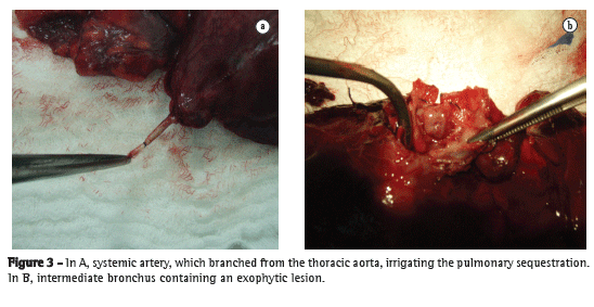 The treatment for PS is surgical resection of the sequestered lobe or segment by thoracotomy or even by video-assisted thoracoscopy. In both cases, the success of the procedure depends on adequate knowledge of the vascular anatomy of the PS and on early ligation of the artery irrigating the PS, because, as previously stated, accidental transection of that artery can lead to massive hemorrhage, with fatal consequences.(4,14) In the case reported here, there was significant hemorrhage, but it was contained by mass clamping and subsequent ligation with continuous sutures.