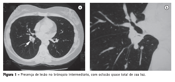 Paciente do sexo feminino, 39 anos, com história de pneumonia de repetição e episódios esporádicos de tosse produtiva e febre. Nos dois anos precedentes, a paciente apresentou quatro episódios de hemoptise de volume moderado. Na investigação pré-operatória, a TC de tórax evidenciou lesão no interior do bronco intermediário (Figura 1), bem como bronquiectasias císticas em lobo inferior direito (Figura 2). A fibrobroncoscopia confirmou o achado tomográfico de uma lesão endobrônquica vegetante, de coloração vinho, na emergência do brônquio intermediário, cuja biópsia da lesão revelou tumor carcinoide típico.