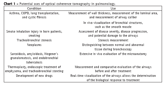 In pulmonary medicine and thoracic surgery, OCT has numerous potential applications and can substantially increase the precision and accuracy of the current bronchoscopic diagnostic techniques (Chart 1). These applications include evaluation of smoke-induced airway injury,(2) evaluation of anastomosis and small airways in lung transplantation, performance of endobronchial biopsies,(21) and measurement of tracheobronchial stenosis,(20) as well as evaluation of normal microanatomy and small airway and smooth muscle thickening in asthma patients,(22) COPD patients,(23) cystic fibrosis patients, and smokers,(24,25) together with pre- and post-bronchial thermoplasty evaluation.(26) In addition, OCT can aid in determining the size of the bronchi in the endoscopic treatment of emphysema with one-way valves.(27)