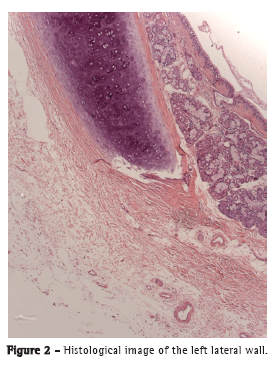 The OCT images were able to delineate, in real time, microstructures, such as the epithelium, submucosa, and cartilage, as well as the adventitia (Figure 1) of the anterior and lateral tracheal walls, similarly to the images produced by conventional histology (Figure 2). In the posterior wall, the layers corresponding to the mucosa, submucosa, and trachealis muscle were clearly differentiated on the OCT images (Figure 3) and were consistent with the histological images (Figure 4).