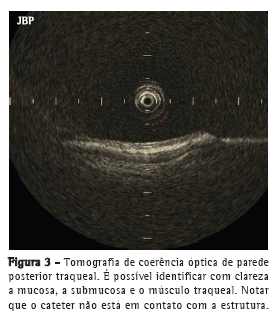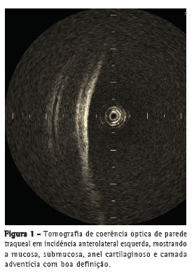Nossos resultados mostraram que a OCT foi capaz de gerar imagens de alta resolução da mucosa, submucosa, cartilagem e camada adventícia traqueais, incluindo microestruturas, como epitélio e pericôndrio, prescindindo de contato entre o cateter e a traqueia, dados esses compatíveis com os da literatura.(5,13)