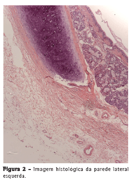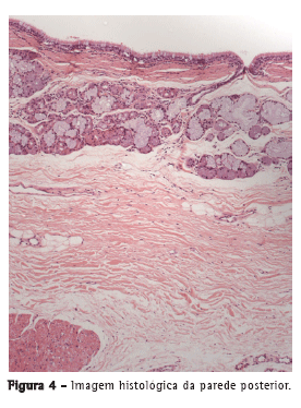 A OCT foi capaz de delinear, em tempo real, microestruturas, tais como epitélio, submucosa, cartilagem e camada adventícia (Figura 1) das paredes anteriores e laterais da traqueia de forma semelhante às imagens histológicas (Figura 2). Na parede posterior, as camadas correspondentes à mucosa, submucosa e musculatura traqueal foram claramente diferenciadas na OCT (Figura 3) e condizentes com a imagem histológica (Figura 4).
