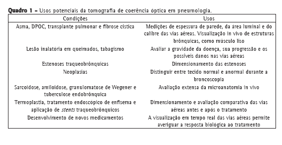 Inúmeras aplicações da OCT podem ser vislumbradas na medicina pulmonar e na cirurgia torácica, com o potencial de aumentar substancialmente a precisão e a exatidão das atuais técnicas diagnósticas por broncoscopia (Quadro 1). Essas aplicações incluem a avaliação de lesões das vias aéreas por inalação,(2) a avaliação de anastomose e de pequenas vias aéreas no transplante pulmonar, a condução de biópsias endobrônquicas,(21) a mensuração das dimensões de estenose traqueobrônquica,(20) a avaliação da microanatomia normal e do espessamento das pequenas vias aéreas e da musculatura lisa na asma,(22) na DPOC,(23) na fibrose cística e em tabagistas,(24,25) assim como a avaliação antes e após a realização de termoplastia brônquica(26) e o auxílio no dimensionamento dos brônquios no tratamento endoscópico do enfisema com válvulas unidirecionais.(27)