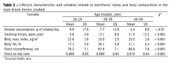 MethodsThe present study was based on a previous analysis of a cross-sectional study involving blood donors and conducted between August of 1999 and January of 2000. The study sample comprised 1,235 adult male blood donors aged 20-59 years and recruited from the Cuiabá Blood Bank, located in the city of Cuiabá, Brazil. Details on the sampling process for that study have been published elsewhere.(13)