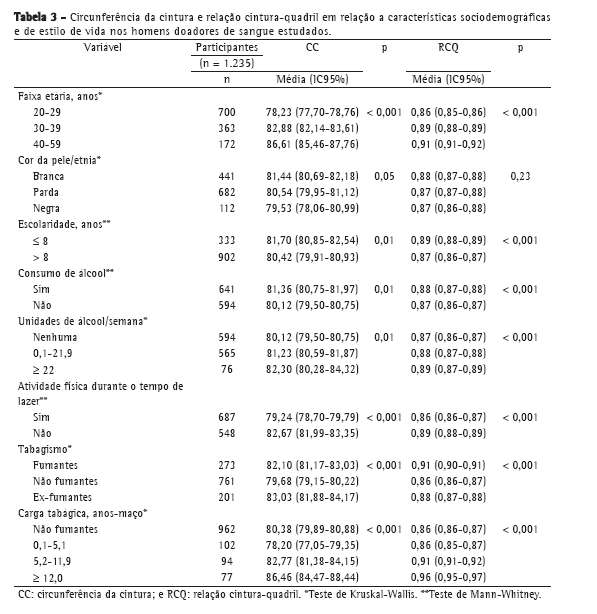 Todas as medidas antropométricas foram realizadas antes da doação de sangue. A circunferência da cintura (CC) foi medida na cintura natural, pois isso reflete de maneira mais precisa o tecido adiposo visceral.(18) A circunferência do quadril foi medida ao nível da extensão máxima das nádegas, no ponto mais proeminente do músculo glúteo. Foi usada uma fita métrica flexível, não extensível, de 200 cm, com 0,1 cm de precisão. As circunferências foram medidas em duplicata, de acordo com as recomendações de Callaway et al.(19) Para calcular a relação cintura/quadril (RCQ), usamos a média das duas medidas da CC e a média das duas medidas da circunferência do quadril.