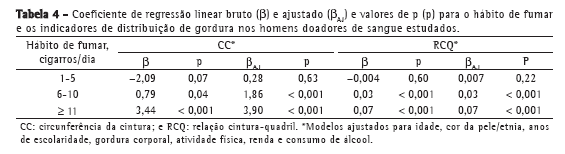 Após os modelos de regressão linear terem sido ajustados para fatores de confusão, o tabagismo permaneceu associado a CC e RCQ (p < 0,001), com efeito independente sobre a gordura abdominal nos fumantes de mais de 5 cigarros/dia (Tabela 4).