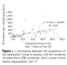 Figures 1 and 2 show the correlation between tuberculosis/HIV co-infection and poverty for the world, as well as showing the incidence of tuberculosis in the countries. There is a direct correlation between tuberculosis/HIV co-infection and poverty, Pearson's correlation coefficients ranging from 0.58 to 0.80, respectively, for the proportion of the population living below the poverty line (an economic indicator that is widely used in order to assess the development of countries) and the prevalence of HIV-positive patients in the population.