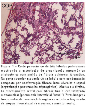 As doenças intersticiais difusas e idiopáticas do pulmão são em grande parte processos inflamatórios crônicos que podem resultar em fibrose e deformação parenquimatosa, constituindo um grupo heterogêneo de entidades classificadas por critérios clínicos, funcionais, radiológicos e histopatológicos.(1-2) O diagnóstico histopatológico contribui, em muitos casos, de forma decisiva para a definição da doença, principalmente quando há correlação positiva com os aspectos radiológicos e com a evolução clínica. Em um número menor de casos, surgem dificuldades devidas à superposição de padrões morfológicos e à pouca representatividade do espécime em relação ao pulmão como um todo.
