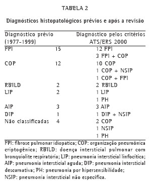 Objetivo: Analisar de forma retrospectiva fragmentos de biópsias pulmonares que receberam o diagnóstico de pneumonia intersticial crônica idiopática, à luz da classificação da American Thoracic Society e European Respiratory Society, de 2000. Métodos: A partir da revisão de 252 fragmentos de biópsias pulmonares a céu aberto de pacientes com doença intersticial pulmonar, no período de 1977 a 1999, 39 casos de doença pulmonar intersticial idiopática foram selecionados e reavaliados por dois patologistas, segundo a classificação da American Thoracic Society e European Respiratory Society, de 2000. Resultados: Vinte e oito dos 39 diagnósticos foram mantidos (71,8%). Uma nova entidade patológica, a pneumonia intersticial não específica, foi incluída na reclassificação e houve superposição de padrões em seis casos. Mantiveram o mesmo diagnóstico 28 casos, 4 casos apresentaram associação entre fibrose pulmonar idiopática e organização pneumônica criptogênica, 1 entre organização pneumônica criptogênica e pneumonia intersticial não específica, e 1 entre pneumonia intersticial descamativa e pneumonia intersticial não específica. Todos os casos de fibrose pulmonar idiopática foram confirmados, embora 3 deles estivessem associados a organização pneumônica criptogênica. Os diagnósticos anteriores foram quase todos mantidos na revisão dos espécimes (p > 0,05). Conclusão: A classificação das doenças pulmonares intersticiais da American Thoracic Society e European Respiratory Society é uma ferramenta útil aos patologistas que lidam com biópsias pulmonares.