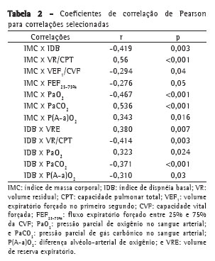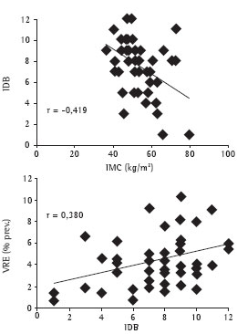 Foram investigadas ainda as correlações existentes entre o IDB e o IMC, com todas as variáveis espirométricas e gasométricas medidas. As correlações que demonstraram significância estatística estão listadas na Tabela 2 e Figura 1. O IMC correlacionou-se positivamente com a relação VR/CPT, PaCO2 e P(A-a)O2, e de modo inverso com a relação entre volume expiratório forçado no primeiro segundo e CVF, e fluxo expiratório forçado entre 25% e 75% da CVF e PaO2. O IDB correlacionou-se de modo inverso com o IMC, P(A-a)O2, PaCO2 e com a relação VR/CPT. O IDB ainda se correlacionou de maneira direta com o VRE e a PaO2.