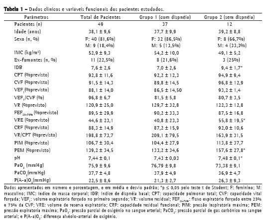 pressões respiratórias máximas e gasometria arterial. Resultados: Doze indivíduos negaram dispnéia e 37 a confirmaram. O índice de
