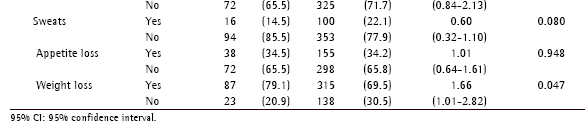 Social and epidemiological characteristics of elderly and nonelderly patients were analyzed and are described in Table 1. Of the total 581 patients with pulmonary TB, 391 (67.3%) were males and 190 (32.7%) were females. The mean age of population studied was 38.5 years (range, 15-87 years). The elderly group comprised patients ranging in age from 60 to 87 years (mean, 66.6 ± 16.5 years). The mean age in the nonelderly group was 31.4 ± 9 years (range, 15 to 49 years). In the elderly group, a history of pulmonary TB was found in approximately 31% of the patients and was approximately twice as common as in the nonelderly group. In the nonelderly group, 34% had had contact with pulmonary TB, and this difference was significant (p = 0.002). The remaining characteristics related to pulmonary TB are described in Table 2. Time since pulmonary TB symptom onset, which was determined in 566 patients, ranged from 0 to 720 days. The median time since pulmonary TB symptom onset was 90 days for the elderly group and 60 days for the nonelderly group, clearly demonstrating the significant difference between the groups (p = 0.0001). However, there were extreme cases in which elderly patients went undiagnosed for more than one year after symptom onset. Respiratory symptoms were studied in 578 patients and were identified in 561, translating to 112 (96.5%) of the elderly patients and 449 (97.2%) of the nonelderly patients. Table 3 shows the frequency and discrimination of these symptoms by group. In this analysis, cough was the equally most common symptom in the sample as a whole (>80%) and was found to present significant associations: with dyspnea in the elderly; and with hemoptysis and chest pain with the nonelderly. Dyspnea was reported in 153 (33.1%) of the nonelderly and 52 (44.8%) of the elderly (p = 0.018), whereas hemoptysis was reported in 216 (46.7%) and 36 (31%), respectively (p = 0.002), and chest pain was reported in 220 (47.6%) and 42 (36.2%), respectively (p = 0.027). Constitutional symptoms were common in both groups (Table 3). However, analyzing each symptom separately, we found that fever was statistically more common in the nonelderly group (p = 0.006), with 314 reports (69.3%), whereas weight loss was more common in the elderly patients (p = 0.047), with 87 reports (79.1%). There was no significant difference regarding the remaining items studied (adynamia, sweating and appetite loss).