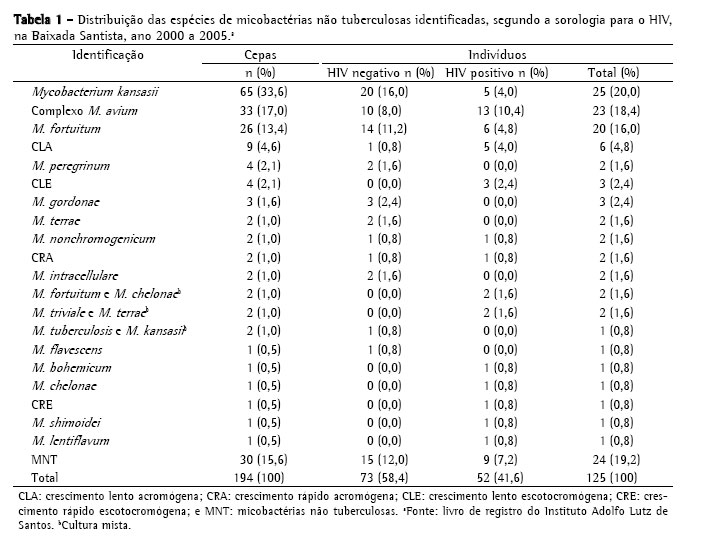Devido à alta prevalência da tuberculose e co-infecção tuberculose e HIV na região da Baixada Santista (SP), este estudo teve por objetivo descrever a freqüência das espécies de MNT identificadas a partir de isolados clínicos de indivíduos HIV negativos e positivos procedentes das unidades de saúde da região.