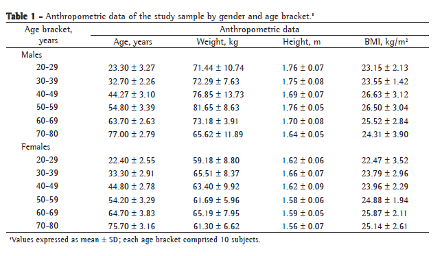The study sample comprised 120 healthy subjects (60 males and 60 females), 20-80 years of age, residing in the city of São Carlos, located in the state of São Paulo, Brazil. Each of the six ten-year age brackets used in the study included 10 male and 10 female subjects.