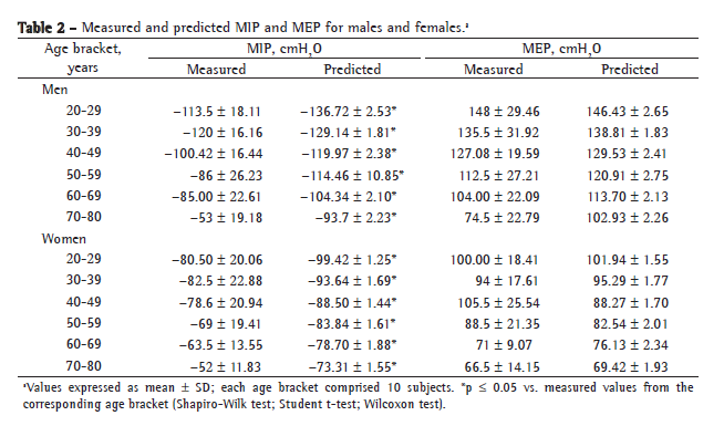 Black and Hyatt(1) measured MIP and MEP in healthy subjects 20-86 years of age and formulated an equation related to the age parameter. Other authors(13) measured the same parameters in White individuals (adults and children), using age, height and weight to consider equations in order to determine predicted values.