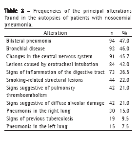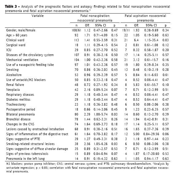 The results of the present study show no association between the outcomes fatal nANP or fatal ANP and other well-known risk factors for NP, such as cardiovascular disease; respiratory disease; previous antibiotic therapy; use of antacids or proton pump inhibitors; use of a nasogastric tube, tracheal cannula or tracheostomy; mechanical ventilation; neurological disease; severity of the underlying disease; and previous surgery, especially thoracic or upper abdominal surgery.(22) However, the frequency of these conditions, especially mechanical ventilation, diseases of the circulatory system and the use of a nasogastric feeding tube, was significant, which underscores the importance of these factors for the development of NP.
