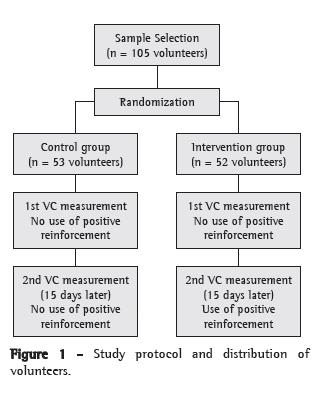 The volunteers included in the study were randomly allocated to one of two groups: control group and intervention group. Randomization was performed with the use of a table of random numbers. Although VC was measured in the two groups, positive reinforcement was provided only to patients in the intervention group (Figure 1).
