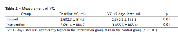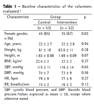 In the present study, there were no significant differences between the control group and the intervention group regarding age, body weight, BMI, systolic blood pressure, diastolic blood pressure, HR or RR. Nor were there any significant differences between the groups regarding patient baseline pulmonary status. Regarding gender, the predominance of females in both groups can be explained by the fact that this study involved students in the area of health care, an area in which this predominance is evident.