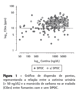Na Figura 1, apresentam-se, mediante um gráfico de dispersão de pontos, os valores de cotinina urinária, todos acima de 50 ng/ml, confirmando o status tabágico dos voluntários. Mesmo assim, 40 pacientes (14,0%) apresentaram valores de COex abaixo de 10 ppm, valor do ponto de corte para classificar o indivíduo como tabagista por este método. Nesse subgrupo, 32 eram do grupo com DPOC e 8 no grupo sem DPOC. Dessa forma, nos pacientes com DPOC, a taxa de falso-negativos foi de 18,4% (fumantes de acordo com o padrão ouro, mas não fumantes pelo nível de COex), enquanto essa, no grupo sem DPOC, foi de 6,7% (p = 0,007).