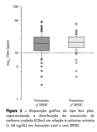 Apesar de todos os pacientes apresentarem confirmação bioquímica quanto ao seu status tabágico, através da medida de cotinina urinária, alguns voluntários, em ambos os grupos estudados, apresentaram níveis de COex < 10 ppm. Possivelmente, esses baixos valores detectados tenham relação com o tempo do último cigarro fumado, que pode ter sido maior do que o previsto, mesmo que tal intervalo de tempo tenha sido padronizado em 60 min e que os pacientes tenham sido insistentemente orientados. O inverso não foi detectado, isto é, eventuais fumantes com cotinina urinária < 50 ng/mL, pois esse foi um critério de exclusão de indivíduos para o estudo.