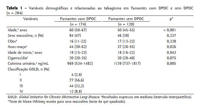 ResultadosForam considerados elegíveis 294 fumantes, dos quais 174 (59,18%) tinham o diagnóstico de DPOC. Todos os voluntários tiveram seu status tabágico confirmado pelos níveis urinários de cotinina ≥ 50 ng/mL. Os pacientes com níveis de cotinina menores que esse valor foram excluídos, mesmo que alegassem ser fumantes.