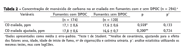 Conforme se pode verificar na Tabela 2, o COex médio em pacientes com DPOC foi 17,1 ± 0,6 ppm, enquanto, nos indivíduos sem DPOC, esse foi de17,6 ± 0,6 ppm, que, embora mais alto neste grupo do que no primeiro, não houve diferença estatisticamente significativa (p = 0,559). Quando os dados foram ajustados por análise de covariância (sexo, idade, idade de início de fumo, nº de cigarros/dia e nível de cotinina urinária), esses valores passaram a ser de 17,8 ± 0,6 ppm e 16,6 ± 0,7 ppm nos pacientes com e sem DPOC, respectivamente (p = 0,200), mantendo a não significância estatística. Os resultados foram mantidos quando se utilizaram dados de base logarítmica (ANOVA univariada: p = 0,133; ANCOVA: p = 0,724).